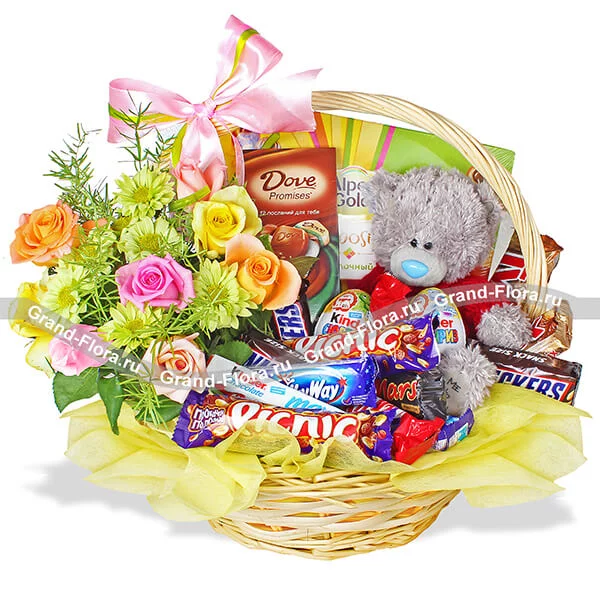 ЛЮКС: роза (микс) - 5 шт., хризантема (зеленая) - 2 шт.( возможна замена на хризантему другого цвета), декоративная зелень, оазис, корзина средняя, желтый фетр, розово-зеленый бант, мишка "Teddy" (возможна замена на плюшевого мишку)- 1 шт., коробка конфет "Alpen Gold" (163 г.) - 1 шт., шоколад Dove - 1 шт., Яйцо "Kinder" - 1 шт., Snikers (маленький) - 2 шт., Picnic - 1 шт., KitKat - 1 шт., Twix - 1 шт., Kinder Chocolate MAXI - 1 шт..